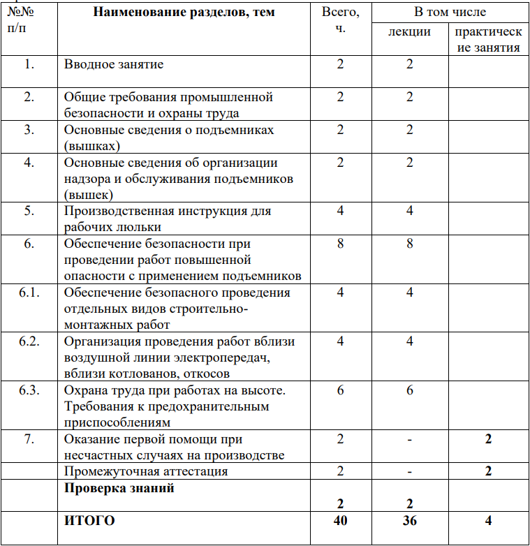 Категория слушателей: лица не моложе восемнадцати лет, являющиеся работниками организаций, выполняющий работы рабочий люльки, находящийся на подъемнике(вышке), имеющих основную производственную профессию и которым по условиям технологического процесса необходимо выполнять работы рабочий люльки, находящийся на подъемнике, либо иные лица без предъявления требований к их уровню знаний .