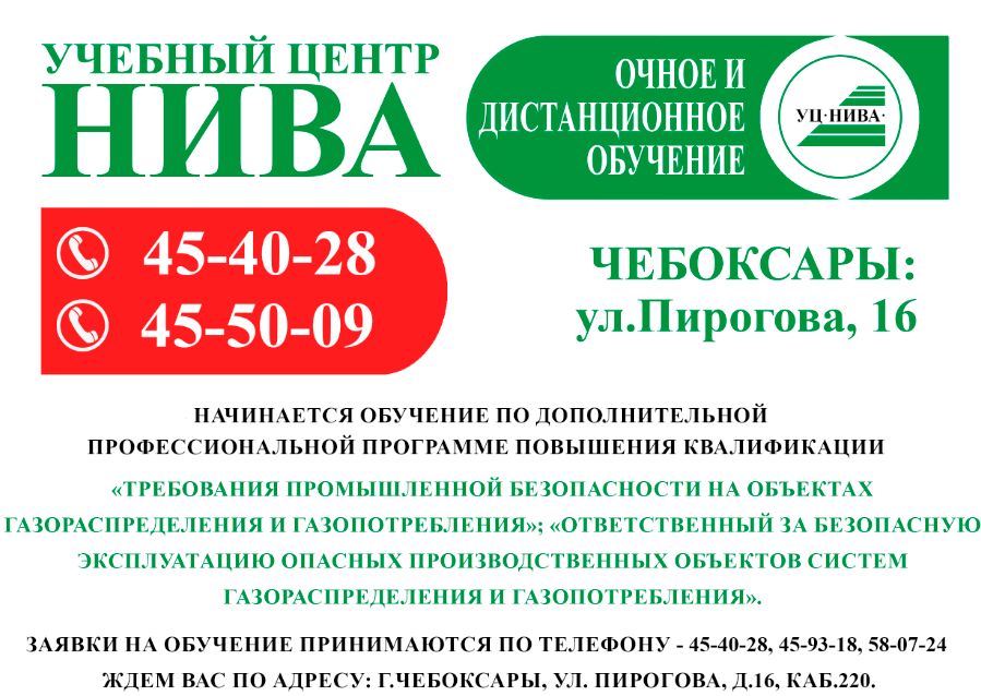 10 ноября 2025 года в АУ ЧР ДПО «Учебный центр «Нива» Минсельхоза Чувашии начинается обучение по дополнительной профессиональной программе повышения квалификации «Требования промышленной безопасности на объектах газораспределения и газопотребления»; «Ответственный за безопасную эксплуатацию опасных производственных объектов систем газораспределения и газопотребления». Заявки на обучение принимаются по телефону - 45-40-28, 45-93-18, 58-07-24 Ждем Вас по адресу: г. Чебоксары, ул. Пирогова, д.16, каб.220.